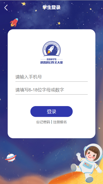 团体报名 注意:学校负责老师必须先行完成学校注册和参赛申请书上传审核,否则,本校学生注册时将判定为“个人报名”,仍需要学生自己上传参赛申请书。已完成注册和参赛申请书上传审核的学校,其学生注册报名时,将自动判定为团体报名,无需本人上传参赛申请书。 2、按要求填写学校信息,阅读《注册须知及参赛规则》并勾选,点击“注册”按钮提交。 注:学校名称请从下拉框选择,如无可选学校,请点击“新增学校库”申请添加 5、参赛申请书提交后,请耐心等待组委会审核。组委会将发送短信通知审核结果。 6、若审核不通过,学校团体报名负责老师需要使用账号,通过“学校登录”进入团体中心,按要求重新上传参赛申请书。 7、参赛申请书审核通过后,学校即完成团体注册。 学校完成注册和参赛申请书审核后,本校学生可以开始注册参赛。 8、点击我的学生,查看本校学生报名信息。 注:学生提交作品后,信息不可再修改,请提醒学生及时确认个人参赛信息 10、学生上传作品后,点击学生右侧操作文件夹,可查看学生提交作品,点击“作品状态”下载,可查看学生作品提交情况。 11、点击“参赛题目”,可查看本届大赛作文题目。 注:初赛试题已公布,请您登录查看!!! (此图为示例图,真题以官方公布为准) 学生注册可以通过电脑端或手机端两种渠道进行。 (一)电脑端 1、学生进入大赛官网www.kepukehuan.com,在首页的注册报名入口,点击“学生注册”。 2、按要求填写注册信息,阅读《注册须知及参赛规则》并勾选,点击“注册”按钮提交。 注:(1)若申请辅导老师证书,请学生务必认真填写辅导老师信息 (2)学生注册时所选学校名称及省市区务必与团报信息保持一致 3、注册成功即生成账号,下次执行后续流程时,通过大赛官网首页的注册报名入口,点击“学生登录”,使用账号登录即可。 4、学生登录进入个人中心,点击“个人资料”可查看注册信息 点击姓名旁“编辑”,可修改个人信息 5、点击“参赛题目”即可查看初赛试题。 注:初赛试题已公布,请您登录查看!!! (此图为示例图,真题以官方公布为准) 6、点击“提交作品”,完成编辑输入,即可提交参赛作品。 (二)手机端 1、关注官方微信公众号“科普科幻作文大赛”(ID:kepukehuan),点击公众号菜单栏“参赛入口”-“学生注册”。 2、按要求填写个人信息,阅读《注册须知及参赛规则》并勾选,点击“注册”按钮提交。 3、注册成功即生成账号,下次执行后续流程时,通过公众号菜单栏“参赛入口”-“学生登录”,使用账号登录即可。 4、学生登录进入个人中心,点击“我的信息”可查看个人报名信息,点击姓名上方“编辑”,可修改个人信息。 5、点击“参赛题目”即可查看初赛试题。点击“作品提交”,完成编辑输入,即可提交参赛作品,为了保障作品质量,请预览无误后再“确认提交”。 注:初赛试题已公布,请您登录查看!!! 【注意】 1、初赛作品提交成功后,将不可修改,选手提交作品前请确认作品无误。 2、获取辅导老师证书,学生必须填写老师信息。 3、初赛报名及作品提交截止至2024年1月2日,请勿延误。