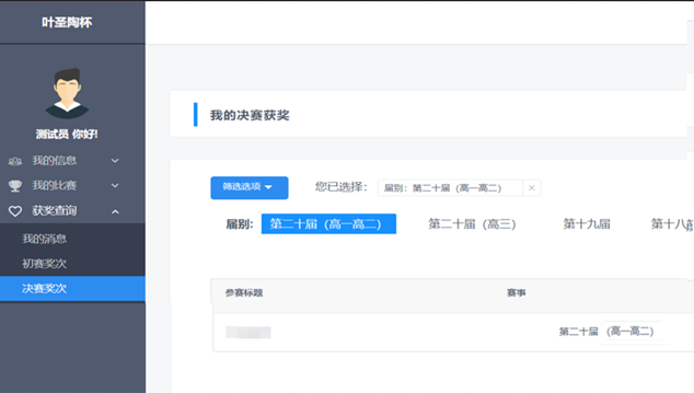 大赛官网首页“学生登录”进入本人参赛注册账号,点击“获奖查询”—“决赛奖次”(如下图)。